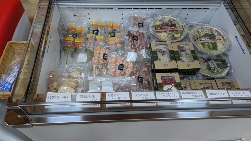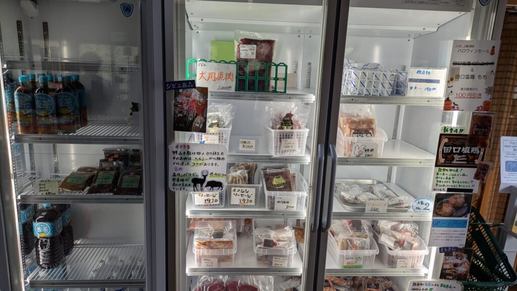内部では薪やキャンプ用品の他にジビエも販売されていました。