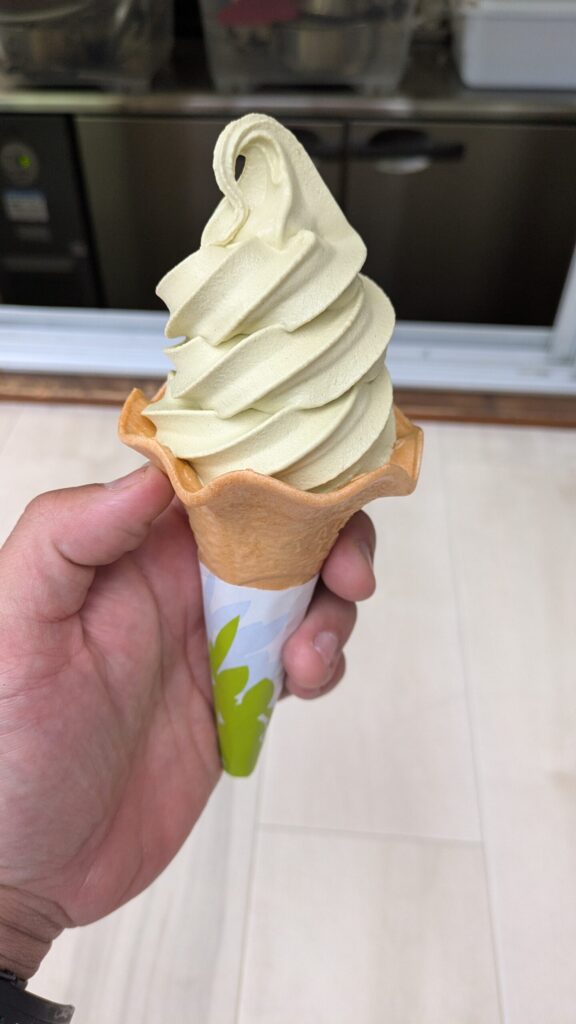 ほうじ茶ソフトクリームを食べてみました。ほうじ茶の風味とソフトクリームの甘さが合わさって美味しかったです。