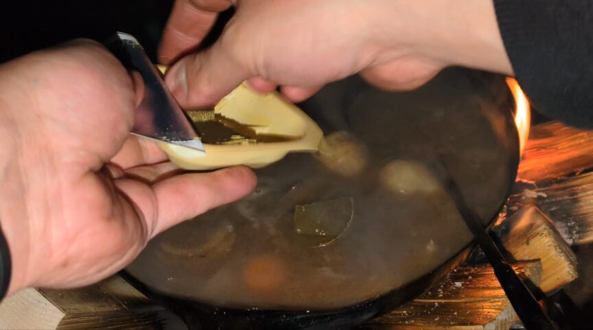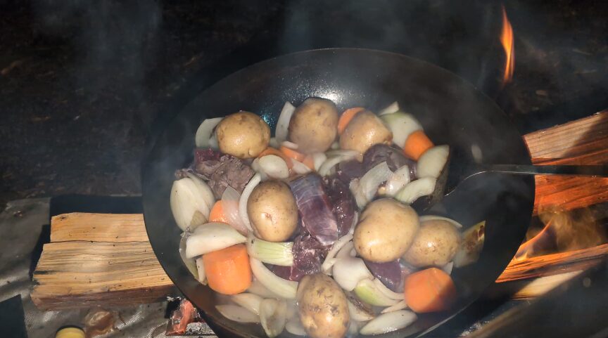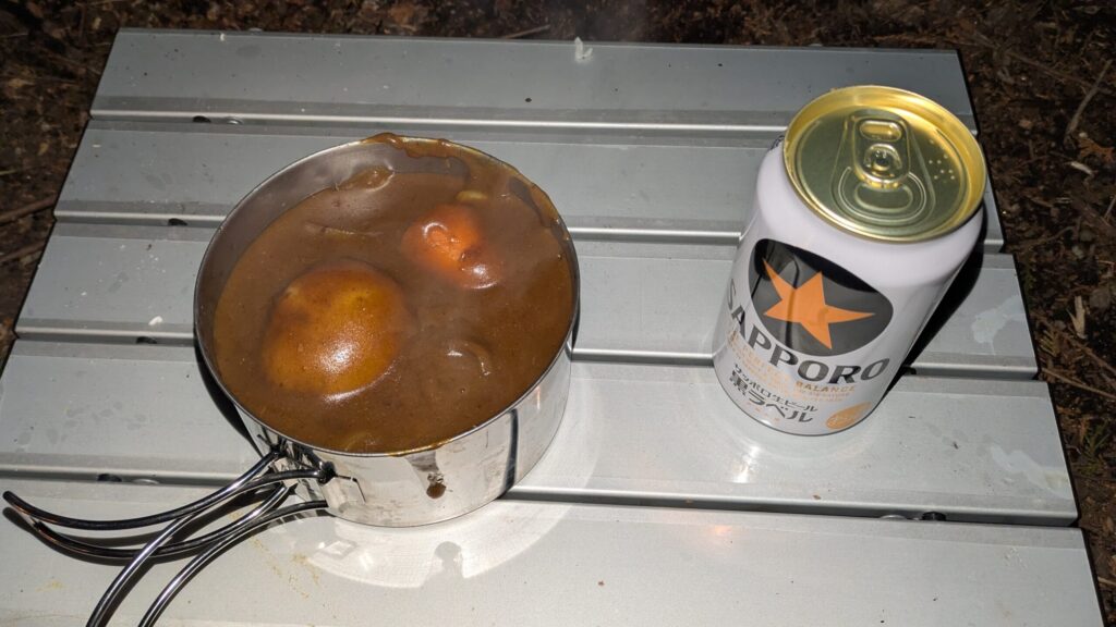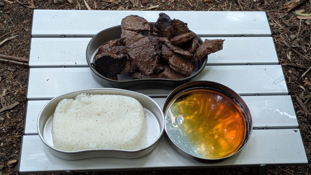 さて、雨も強くなり、夜も深くなってきました。キャンプの醍醐味の時間が近づいてきました。本日の夕食は鹿肉のカレーです。