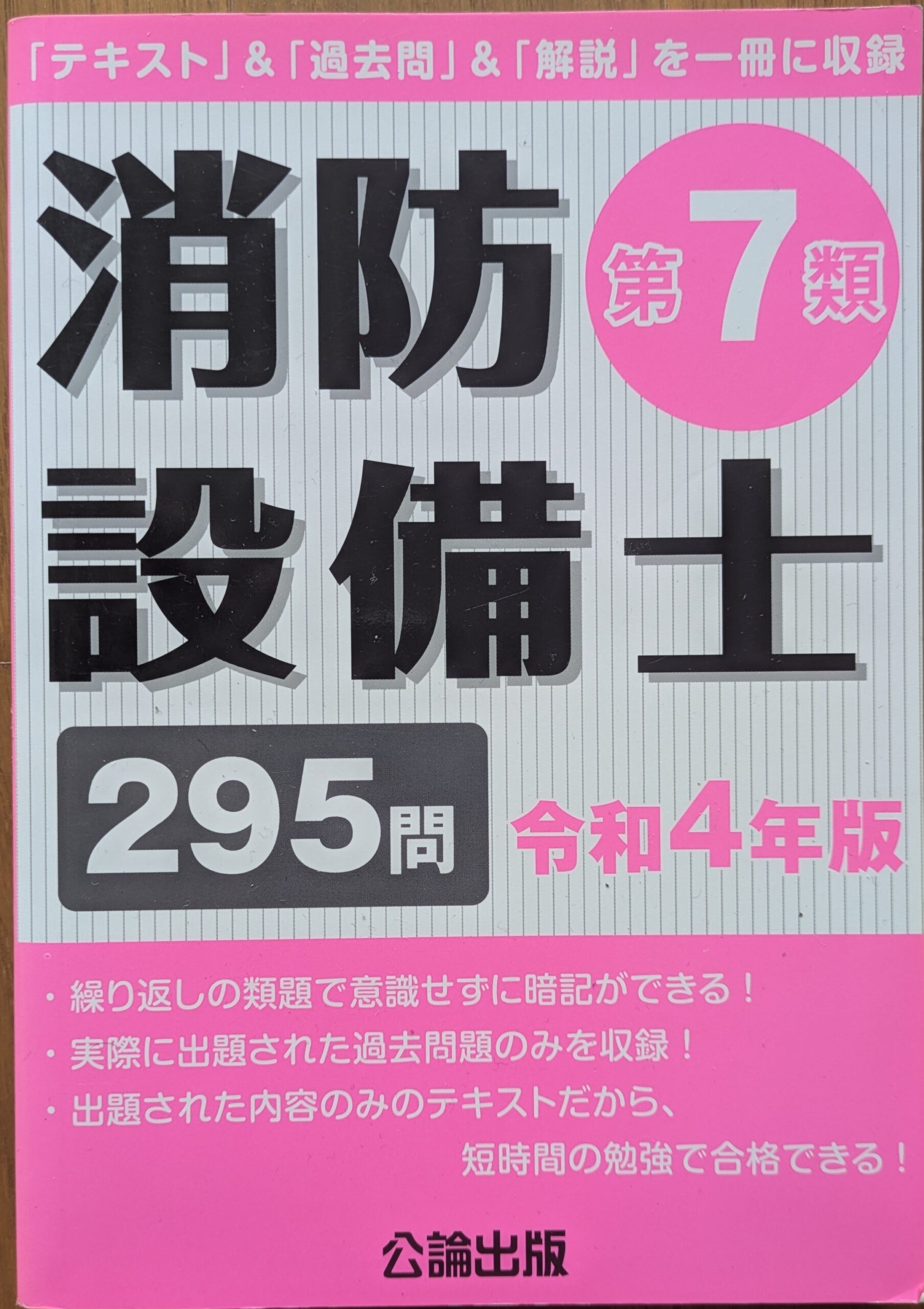 使用する参考書は、このブログではおなじみの公論出版のテキスト『消防設備士第7類』です。公論出版のテキストは本当によく作られています。電気書院やユーキャン等他にも良いテキストを販売する出版社はありますが、僕は過去問演習をがっつりやりたいタイプなので、この公論出版のテキストを一番に推したいです。